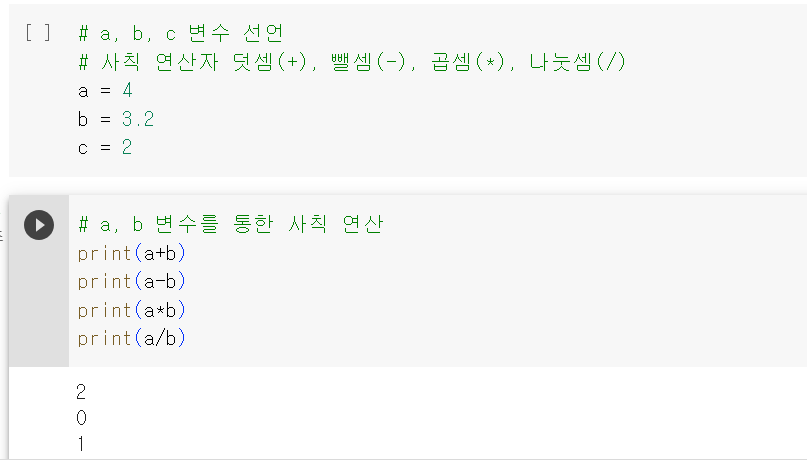 그 이후 밑에 코딩창에서 a,b 변수를 통한 사칙 연산 진행후 출력.