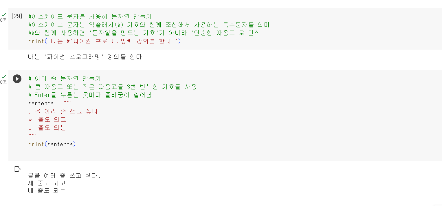 | 파이썬(python) 기초 실습 예제 이스케이프 문자 줄바꿈, 역슬래시, 작은 따옴표, 큰 따옴표 (0) | 2023.07.15 |